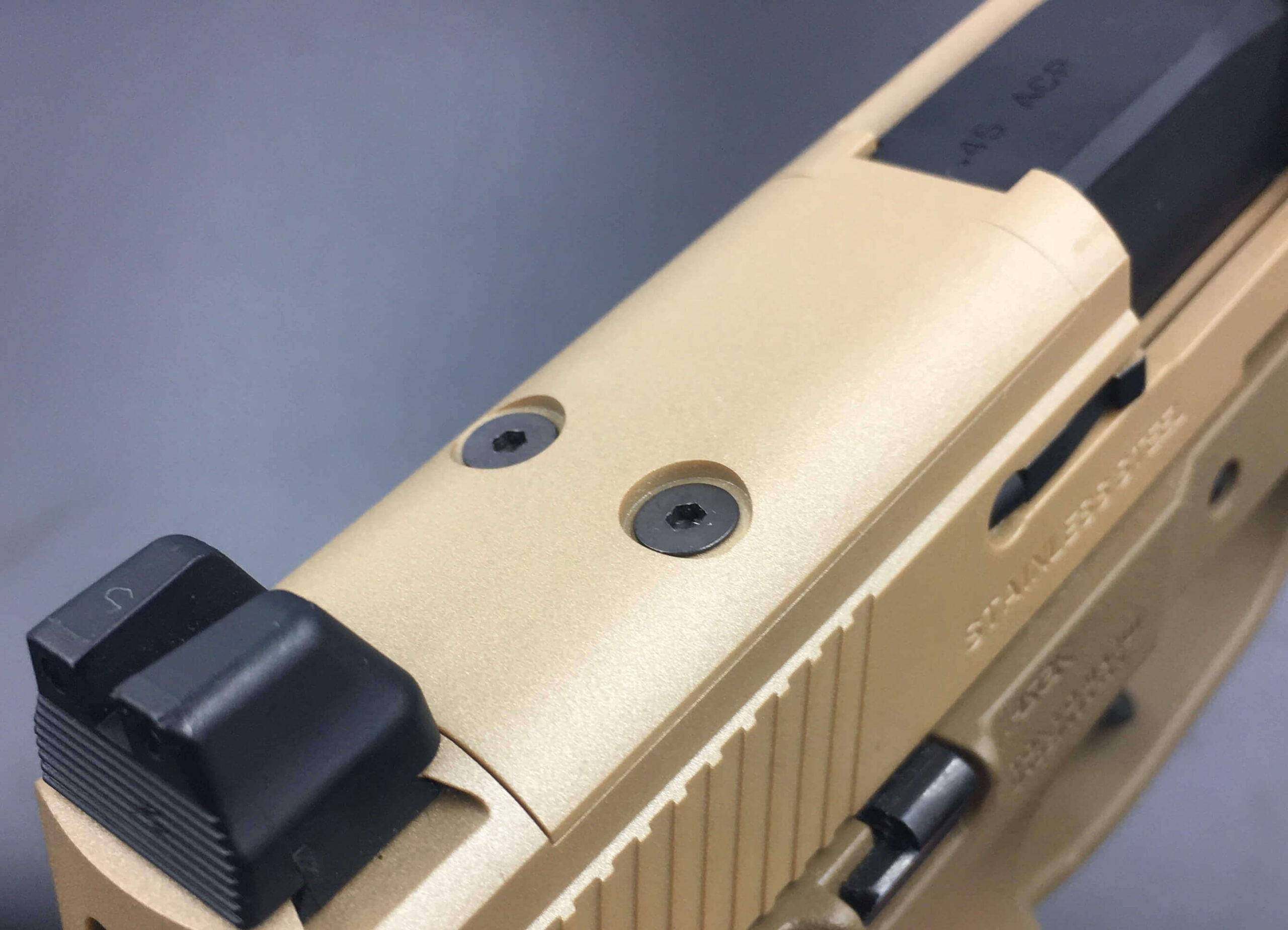 スライドの上にはFNX-45の売りの一つである光学機器を乗せることができる場所に6角ネジ日本でカバーされていますね。