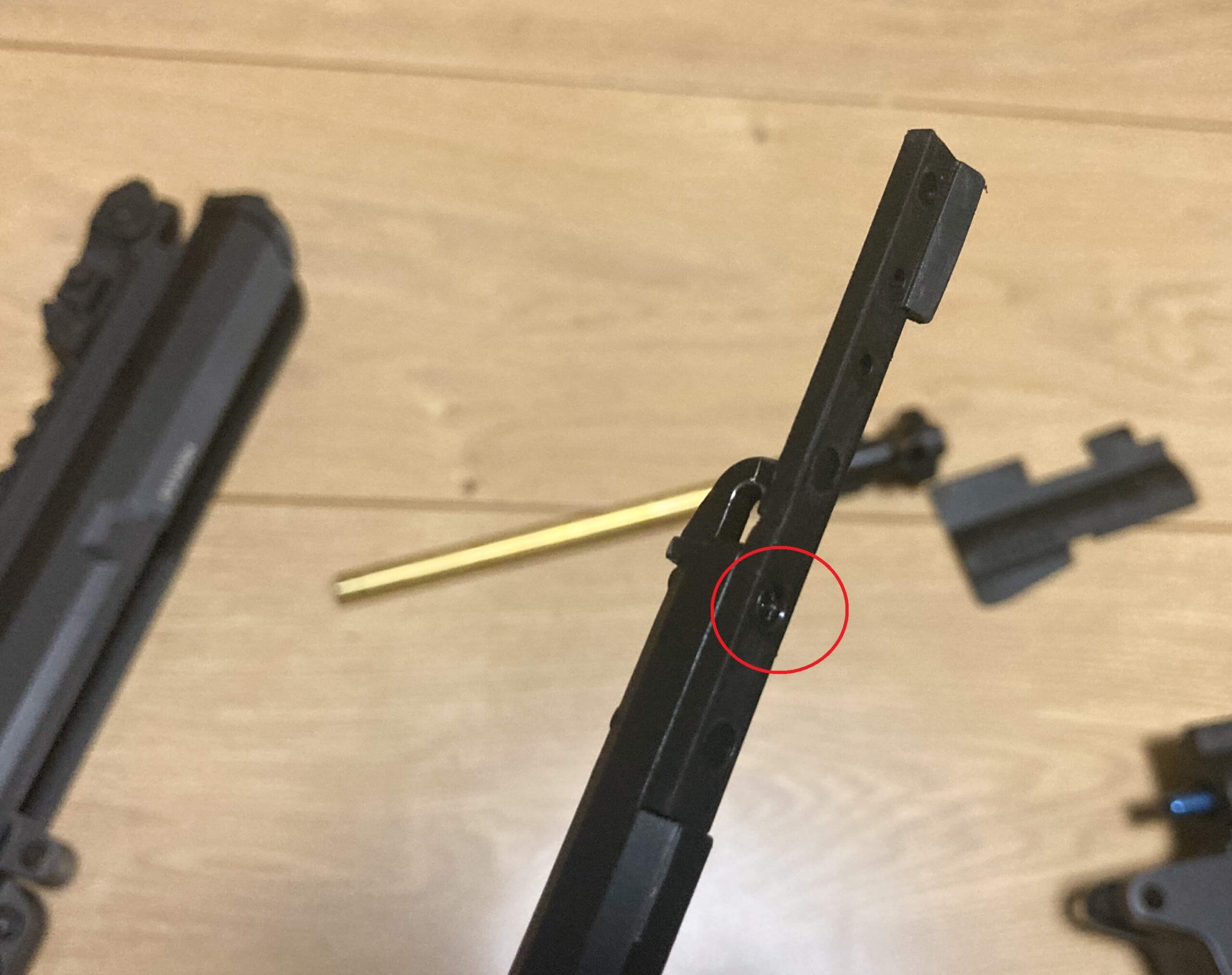 通常のAR系同様で赤丸の2つのピンを引き抜くことで分割できますが、ピンの紛失防止で六角ネジを使わないと分解できないようになっています。