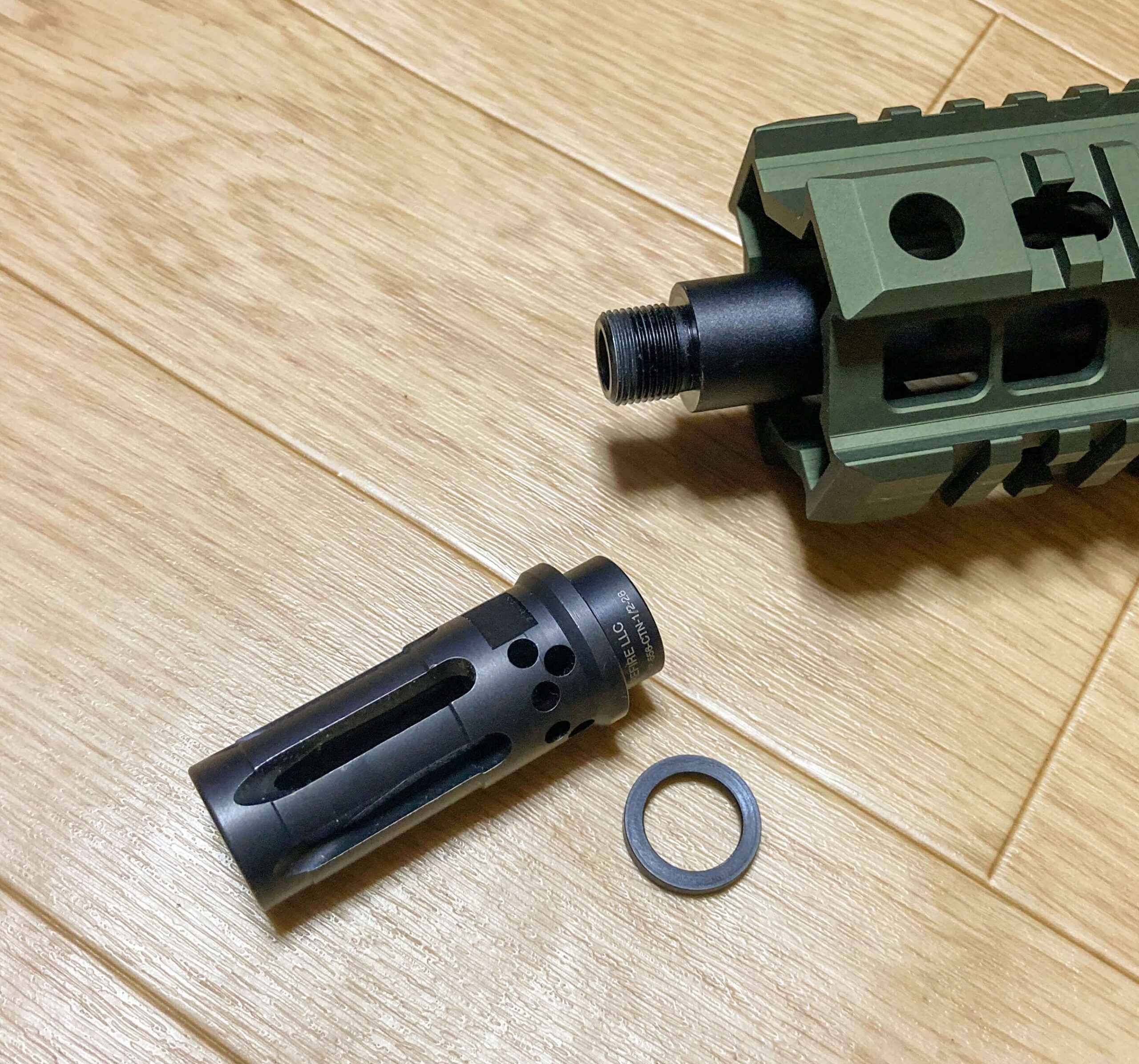 ハイダーは14㎜逆ネジなのでお気に入りのパーツのAirsoft Artisan製のSF COMPハイダーを装着します。