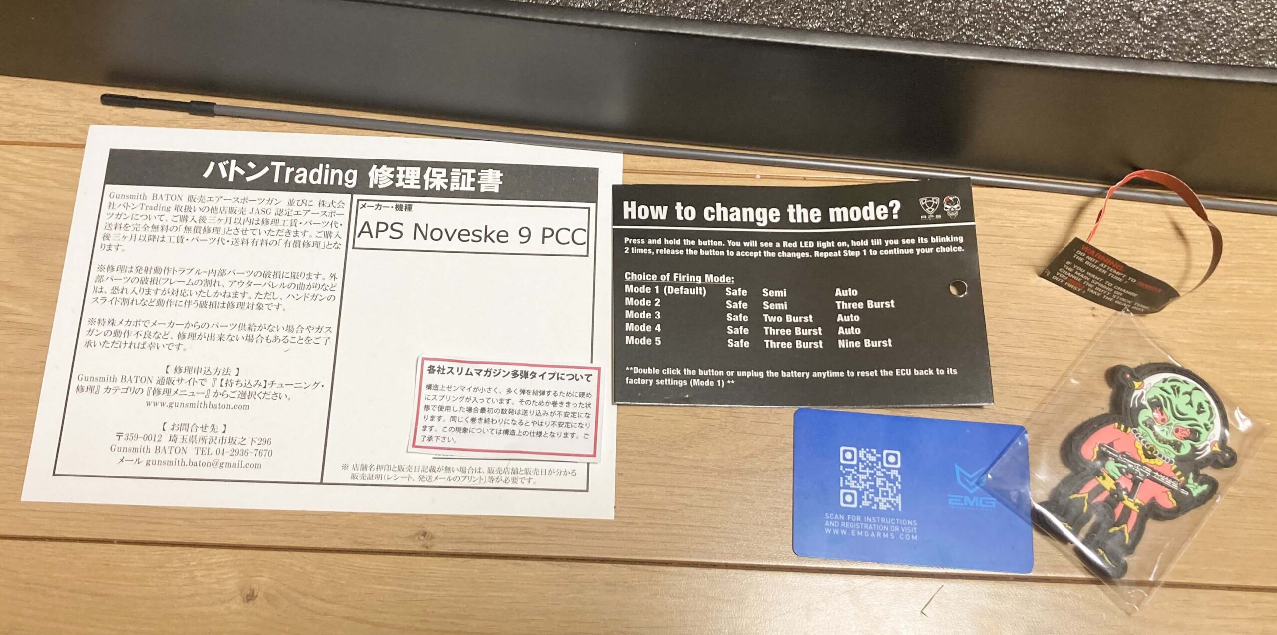 付属品は本体、保証書、EMGライセンスカード、電子トリガーセットアップ説明書、ラバーパッチなどが付属します。