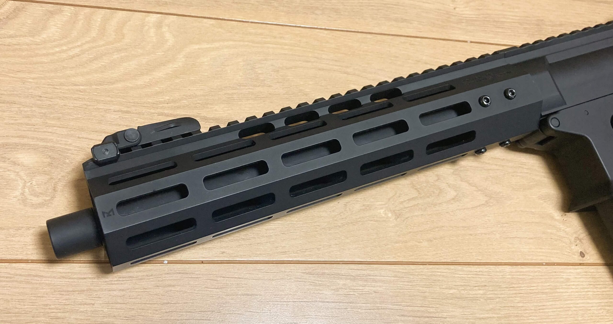 普通のARではフラッシュハイダーなどのマズルデバイスが装備されていますが、NOVESKE9ではなんとただのマズルカバーで反動抑制系のマズルデバイスが一切装備されていません!