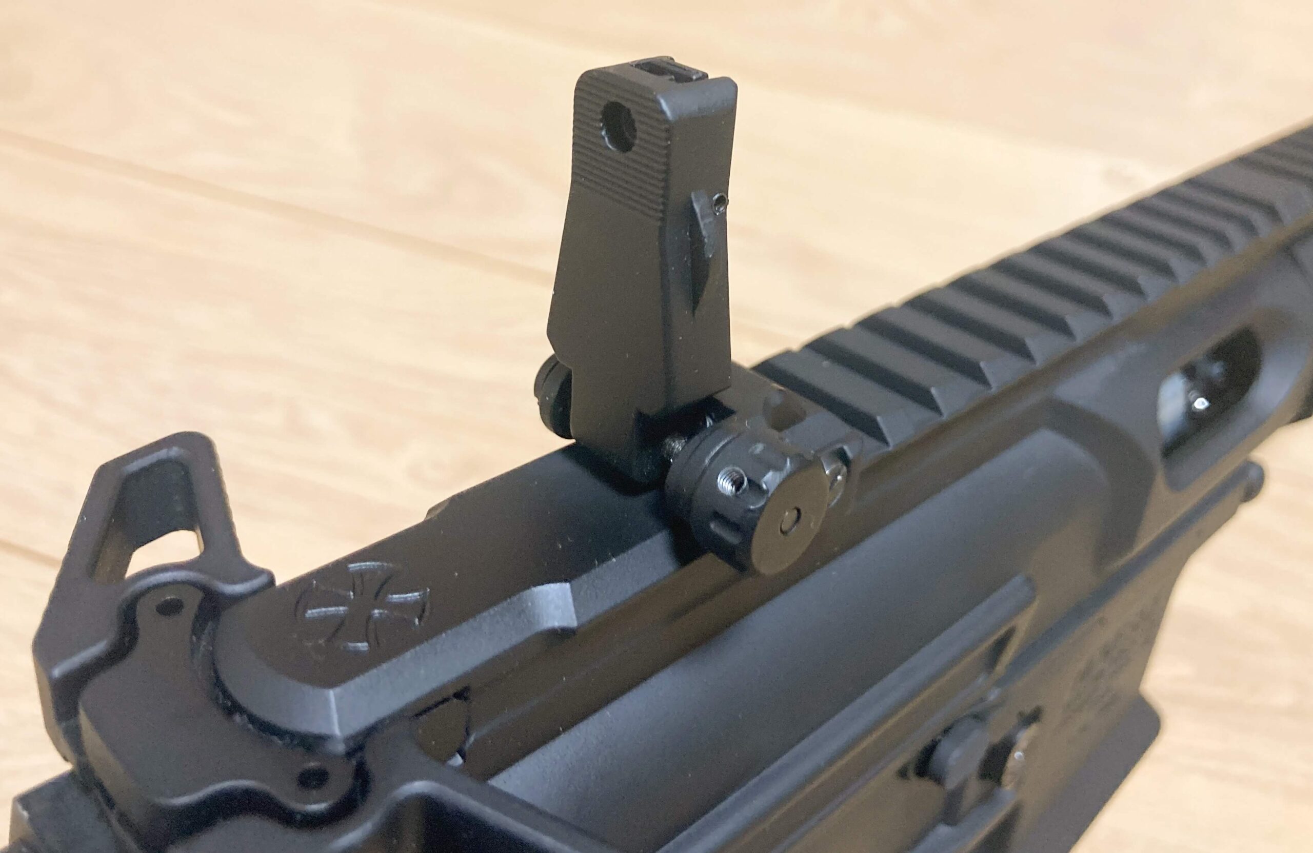 フロントサイトはフリップアップタイプが初期装備されています。